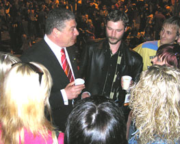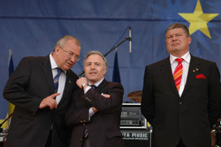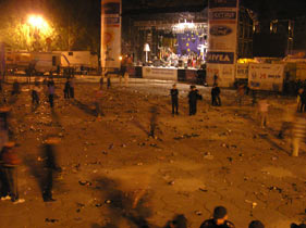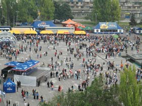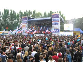 26 мая в городе Запорожье прошел День Европы. В Украине этот "день" празднуют уже в четвертый раз, в Запорожье - впервые. Европейский городок (палатки стран Евросоюза) открылись на Фестивальной уже к 15.00. Скажем сразу: особого ажиотажа вокруг них не наблюдалось, но народ все-таки был. Наши, в отличие от шустрых и веселых европейцев, все больше с мрачными физиономиями, упорно нагребали в палатках европейской атрибутики и ждали концерта. К слову: площадь была уже полностью забита народом к 21.00. Концерт Обещанного некоторыми СМИ :( (в том числе и нами, по "следам" этих СМИ), "THE CARDIGANS" так и не было. Приехали отечественные "ТНМК" и "ВВ", а со стороны Европы - прибалтийские "еэсовцы" :): группа "BRAINSTORM". Украинские исполнители, в меру своих возможностей, рассказывали о том, как классно живется в Европе и взывали к патриотическим чувствам (даже гимн пели), "BRAINSTORM"... - просто выделывался. В общем, мероприятие было немного затянуто, салют вяленький, а в остальном - все в норме... хотя, у каждого может свое мнение на этот счет |