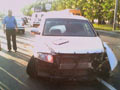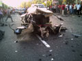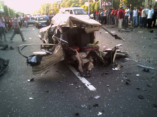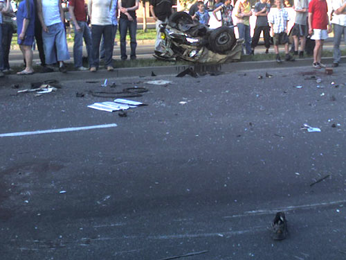 Хозяин джипа, впоследствии, утверждал, что он ехал на зеленый свет. Как бы там ни было столкновение было чудовищной силы. От удара "шестерку" разорвало на пополам, из разваливающейся машины вылетали люди (в машине было четыре человека). "Фольсваген", в котором был один водитель, перелетел разделитель дороги. |