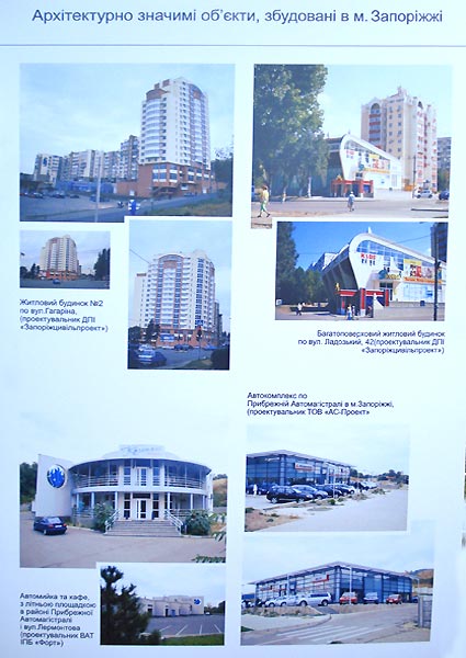 Архитектурно значимые объекты, построенные в Запорожье: - Жилой дом №2 по ул. Гагарина; - Многоэтажный жилой дом по ул. Ладожской, 42; - Автокомплекс по Набережной магистрали; - Автомойка и кафе с летней площадкой по Набережной автомагистрали |