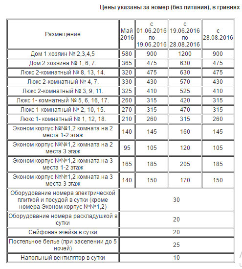 Проживание: КОРПУСА: 2 корпуса, двух и трехместные номера Эконом Комплектация: холодильник, стол, стулья, кровати. Туалет и душ на территории. Номера есть с балконом есть без балкона Номера люкс 3 места: Комплектация: гостиная с диваном и телевизором, кондиционер, холодильник. Удобства все в номере, горячая вода, есть номера с балконом и без балкона. Номера люкс 2 места: Комплектация: кондиционер, телевизор, холодильник удобства все в номере, горячая вода, есть номера с балконом и без. |