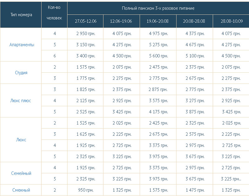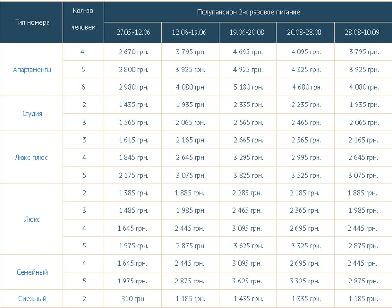 "Апартаменты", "Люкс плюс", "Люкс", "Студия" и "Семейный",