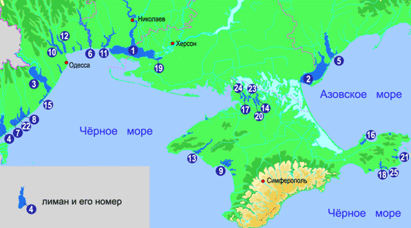 Молочный, 6 – Тилигульский, 7 – Шаганы, 8 – Алибей, 9 – Сасык-Сиваш, 10 – Хаджибейский, 11 – Березанский, 12 – Куяльницкий, 13 – Донузлав, 14 – Айгульское, 15 – Будакский, 16 – Актаское, 17 – Красное, 18 – Узунларское, 19 – Збруевский Кут, 20 – Кирлеуцкое, 21 – Тобечикское, 22 – Карачаус, 23 – Кияцкое, 24 – Старое (Тузлы), 25 – Кояское.