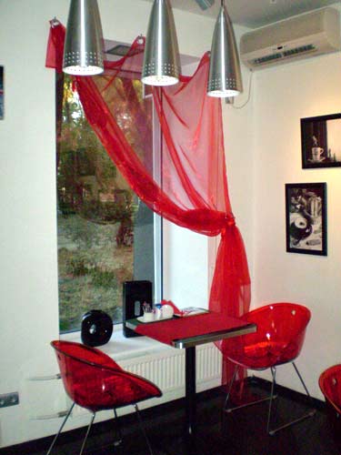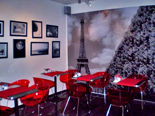 напоминает парижское кафе. Основные цвета: красный и черный. На стенах стильные