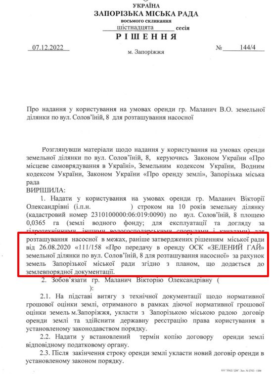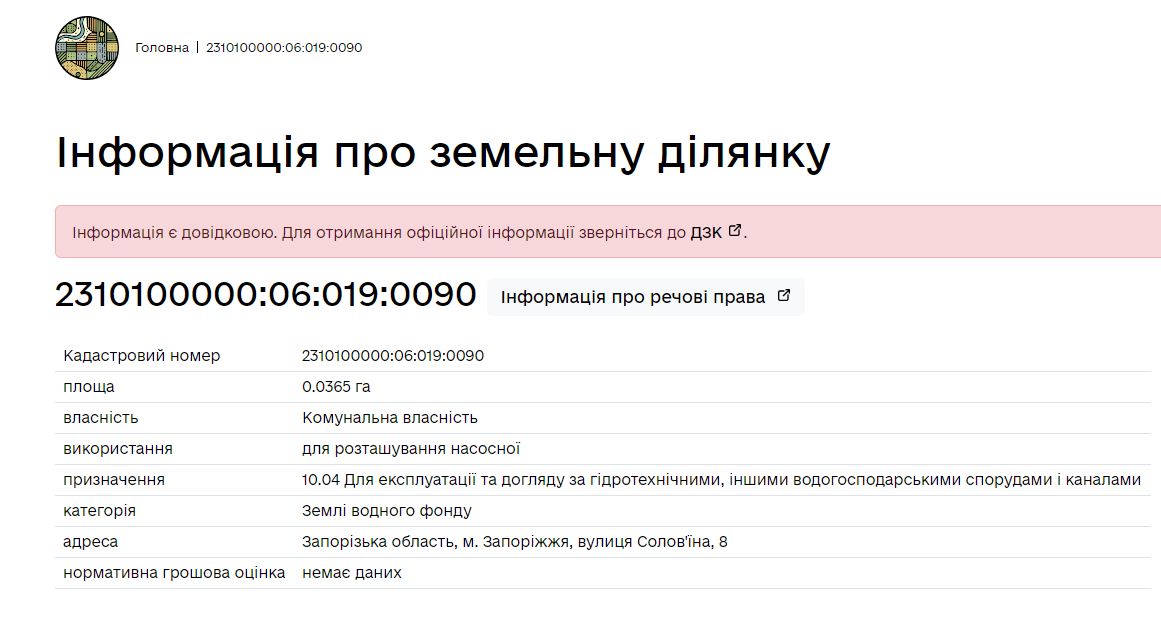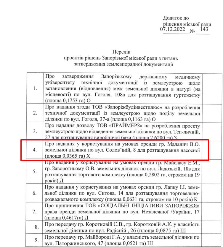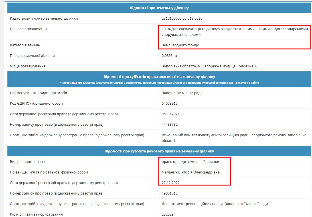 За даними з кадастрової карти, ділянка, на якій зведено будинок, перебуває в оренді з кінця 2022 року. Користувачка – Вікторія Маланич, дружина депутата Запорізької міської ради Василя Полюсова. Сам депутат очолює земельну комісію міськради та є директором КП «Градпроект», яке займається землеустроєм та геодезією.