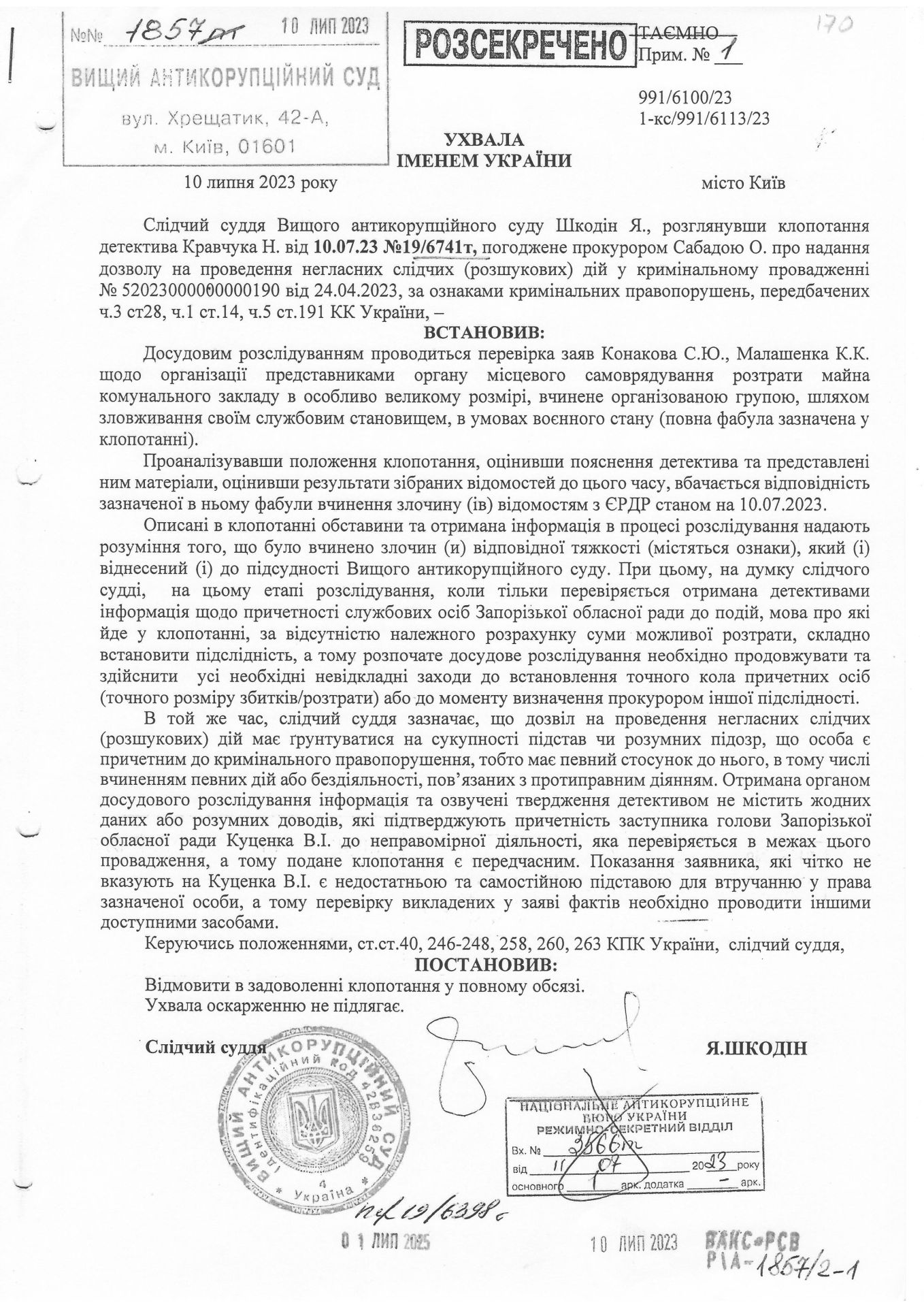 Вищий антикорупційний суд (ВАКС) ще 10 липня 2023 року виніс ухвалу (справа №1857), якою відмовив детективам НАБУ у проведенні негласних слідчих дій стосовно Владислава Куценка.