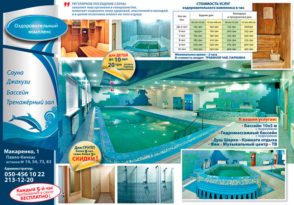 К вашим услугам: - бассейн 10х5 м с подогревом; - финская парная; - гидромассажный бассейн с подогревом; - душ Шарко; - комната отдыха. РАБОТАЮТ КРУГЛОСУТОЧНО. ПРЕДВАРИТЕЛЬНЫЙ ЗАКАЗ ПРИВЕТСТВУЕТСЯ! По всем вопросам, записи, организации мероприятий, кооперативов, праздников обращайтесь к администрации Комплекса! ПОСТОЯННЫМ КЛИЕНТАМ – ХОРОШИЕ СКИДКИ! |