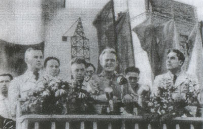 Л.И. Брежнев (крайний справа) на митинге на заводе "Запорожсталь" в 1947 году