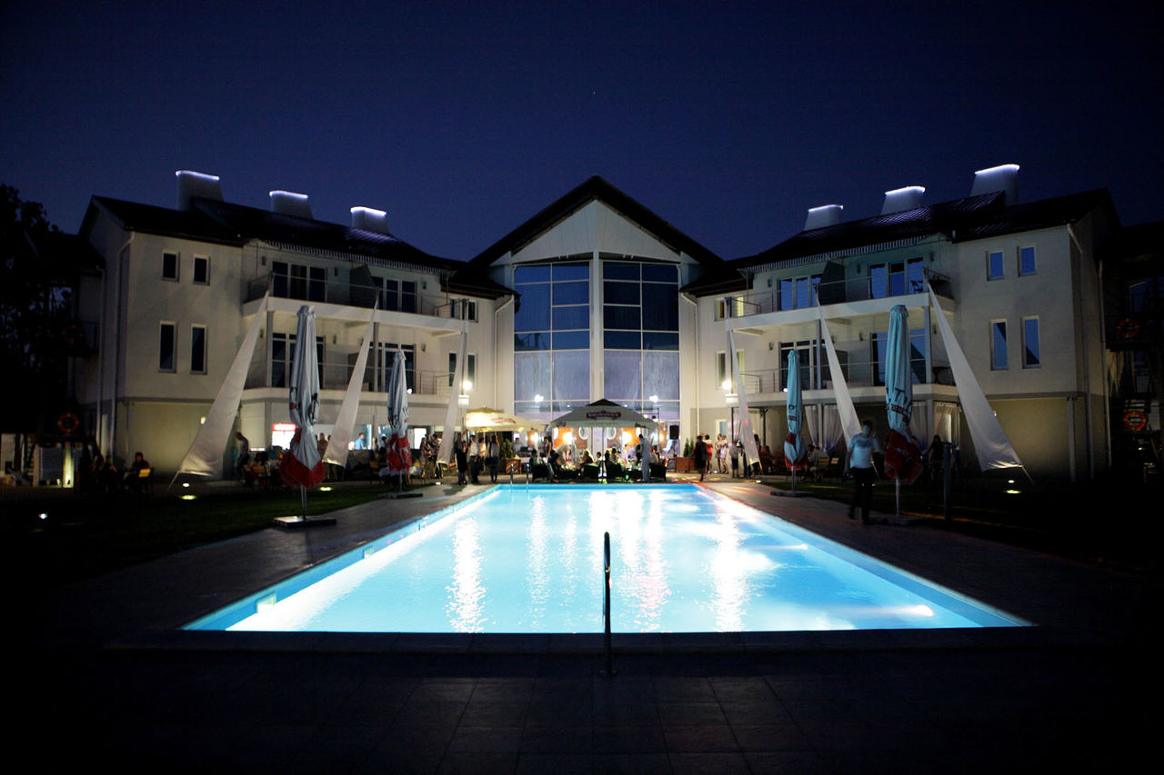 В комплексе есть номера для отдыха, летняя площадка, бассейн и даже яхт-клуб.