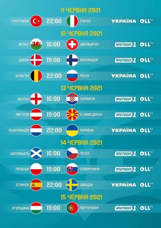 • 13.06.21. 22:00 Нидерланды -Украина – телеканал "Украина", Oll.tv;