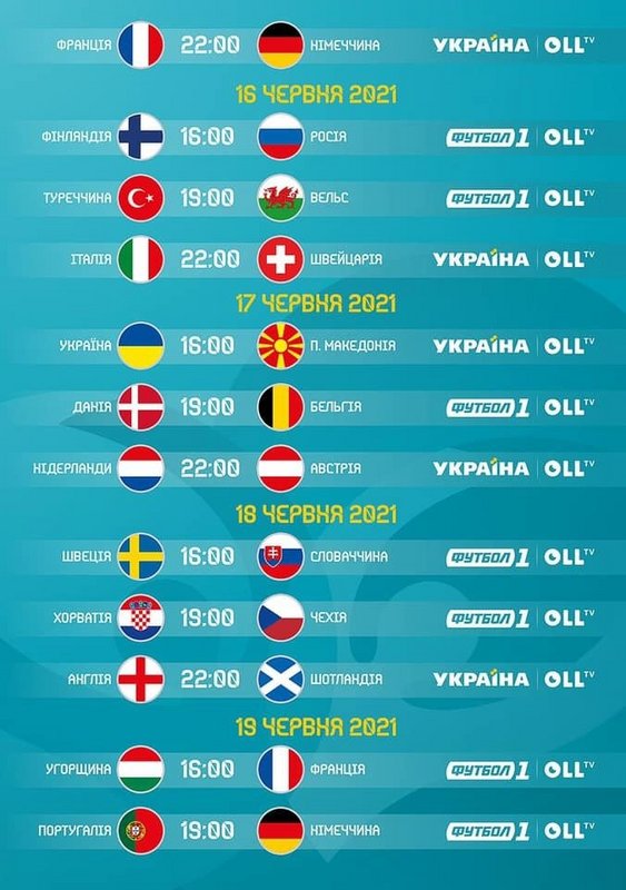 • 17.06.21. 16:00 Украина -Северная Македония - телеканал "Украина", Oll.tv;