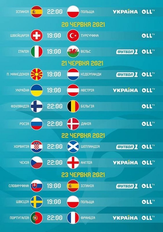 • 21.06.21. 19:00 Украина -Австрия - телеканал "Украина", Oll.tv;