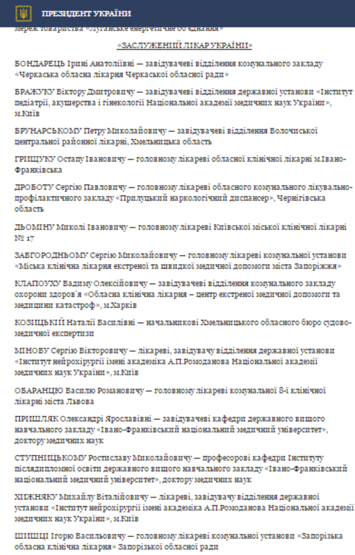 23 января на сайте Президента Украины появился Указ, в котором перечислялись выдающиеся жители Украины. В честь Дня Соборности Петр Порошенко раздал награды заслуженным артистам, юристам, врачам и ученым. Среди выдающихся деятелей в сфере медицины оказались и врачи из Запорожья.