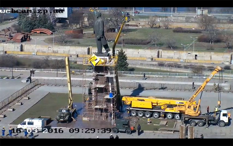 В Запорожье к памятнику Ленина подогнали дополнительную технику. Прибытие на пл. Запорожскую высотного крана ознаменовало начало демонтажа непосредственно фигуры Ильича.