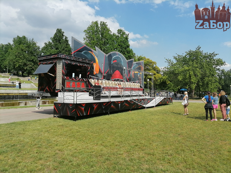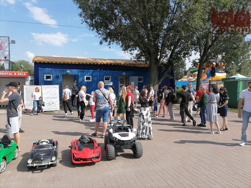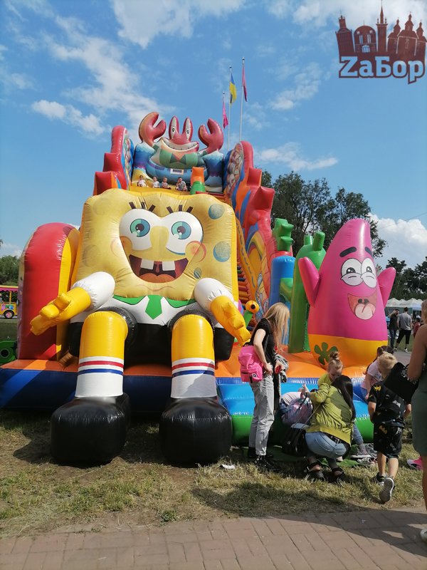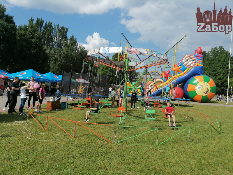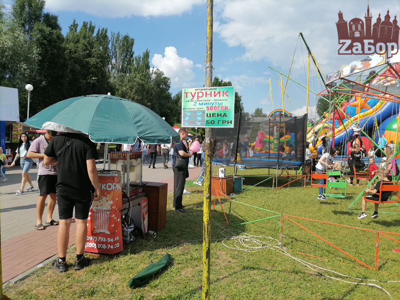 Традиционно работала и зона с аттракционами. Здесь расположились несколько батутов, детские цепи и еще один аттракцион, на котором не было указано названия и цен. А еще можно было проверить свои силы на турнике и выиграть 500 грн. Условия простые, нужно было провисеть на турнике 2 минуты. Стоимость такого развлечения 50 гривен. Работал и развлекательный центр "Волкленд". Кроме этого, тут можно было разукрасить картинку цветным песком (стояло таких локаций порядка 5 штук) и нарисовать свой портрет.