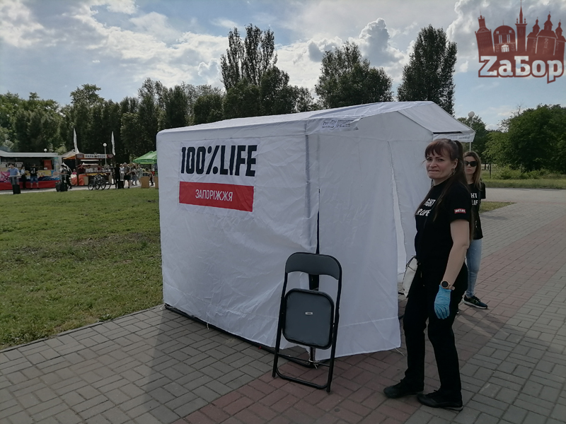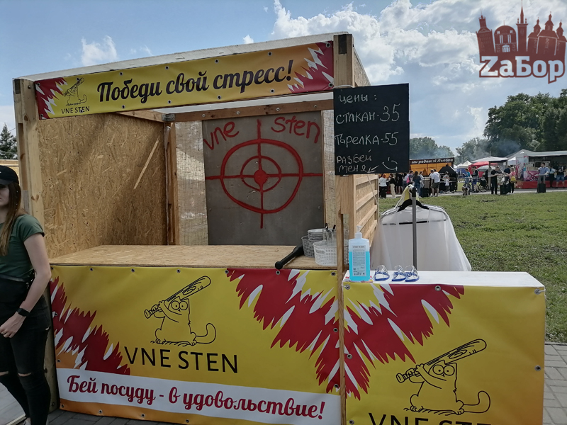 Кроме традиционных локаций, здесь появилось и несколько новых. Так, тут установили палатку "100% Life", где можно было сделать бесплатный тест на ВИЧ-инфекцию. А рядом с ним, расположились представители от нового заведения-антистресс "Вне зоны". Отдыхающим предлагали побить посуду, правда не бесплатно. Цены на битье были такие: стакан – 35 гривен, тарелка – 55 грн.