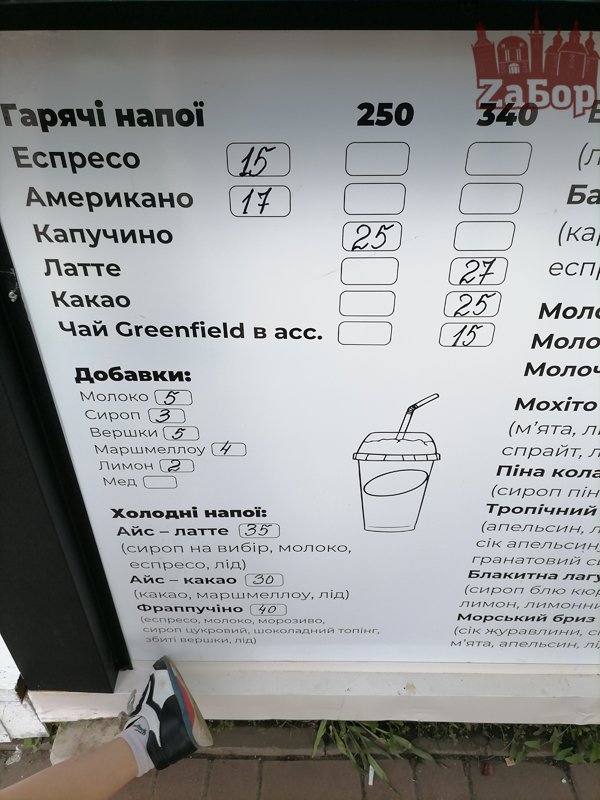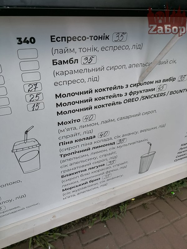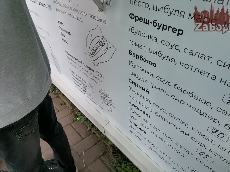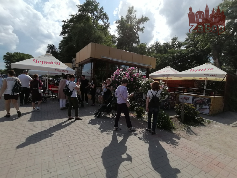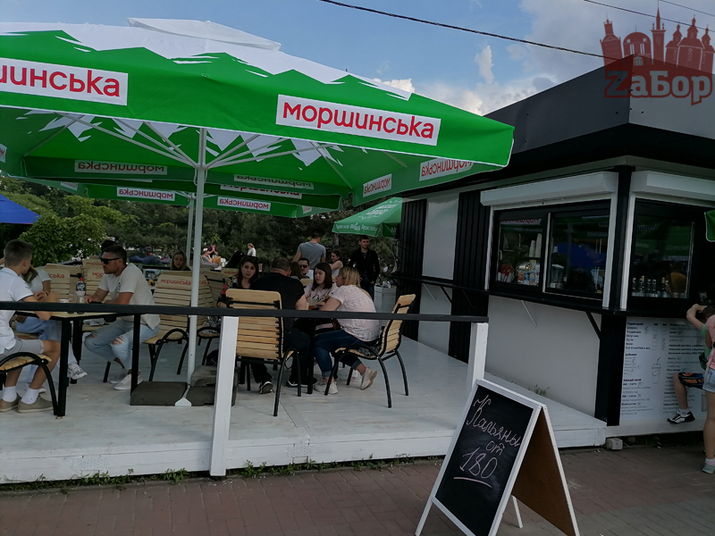 Начало тут работать и новое кафе, которое ранее установили с помостами прямо на склоне, где обычно отдыхают люди. Стоит отметить, что когда кафе устанавливали, то в мэрии не смогли ответить, что именно здесь будет. А после того, как местные жители стали возмущаться, что застраивают склон, кафе вместе с помостами перенесли в линию к другим ларькам. В новом заведении продаются напитки, кофе и бургеры. Цены тут следующие: бургеры от 69 до 75 гривен, коктейли от 35 до 45 грн, кофе: эспрессо – 15 грн, американо – 17 грн, капучино – 25 грн, какао – 27 грн и чай – 17.