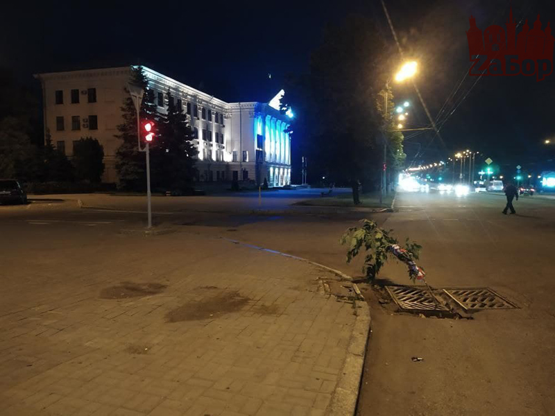 Возле запорожской мэрии прямо на проезжей части в ливневку воткнули ветку с дерева, причем она не маленьких размеров. Так, на фото заметно, что возле ливневки образовался провал, а из него торчит ветка, которая обмотана сигнальной лентой.