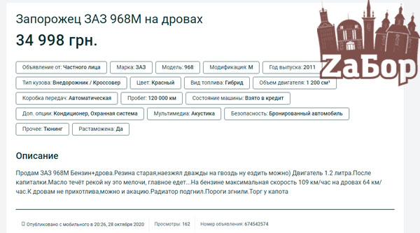 28 октября 2020 года на одном из ресурсов частных объявлений снова появился в продаже чудо-Запорожец. Правда цена его выросла почти в половину, и вместо 15 000 он теперь стоит 34 998 гривен. Сам автор объявления пишет: "Продам ЗАЗ 968М Бензин+дрова.Резина старая,наезжал дважды на гвоздь ну ездить можно) Двигатель 1.2 литра.После капиталки.Масло течёт рекой ну это мелочи, главное едет...На бензине максимальная скорость 109 км/час на дровах 64 км/час.К дровам не прихотлива,можно и акацию.Радиатор подгнил.Пороги згнили.Торг у капота".