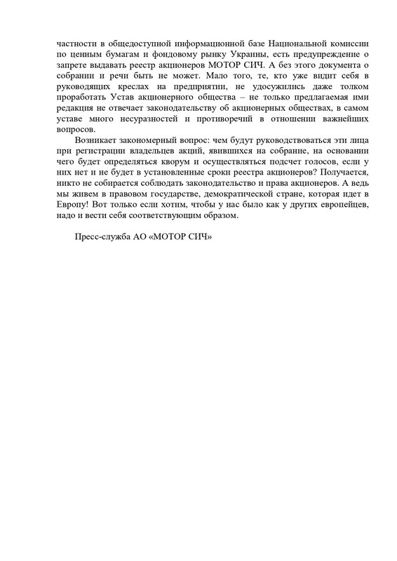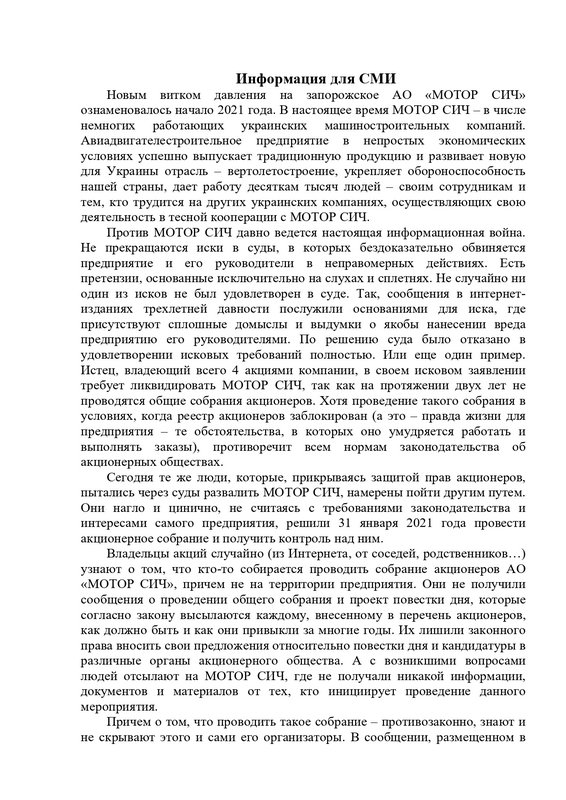 "Враховуючи, що повноваження наглядової ради ПАТ "Мотор Січ" закінчилися, цей орган має нині тільки право скликати загальні збори акціонерів. Однак незважаючи на багаторазові звернення акціонерів ПАТ «Мотор Січ», чинна «наглядова рада» цю функцію не виконує. Такі дії ми розцінюємо як спробу захоплення підприємства та вважаємо за необхідне провести загальні збори акціонерів найближчим часом".