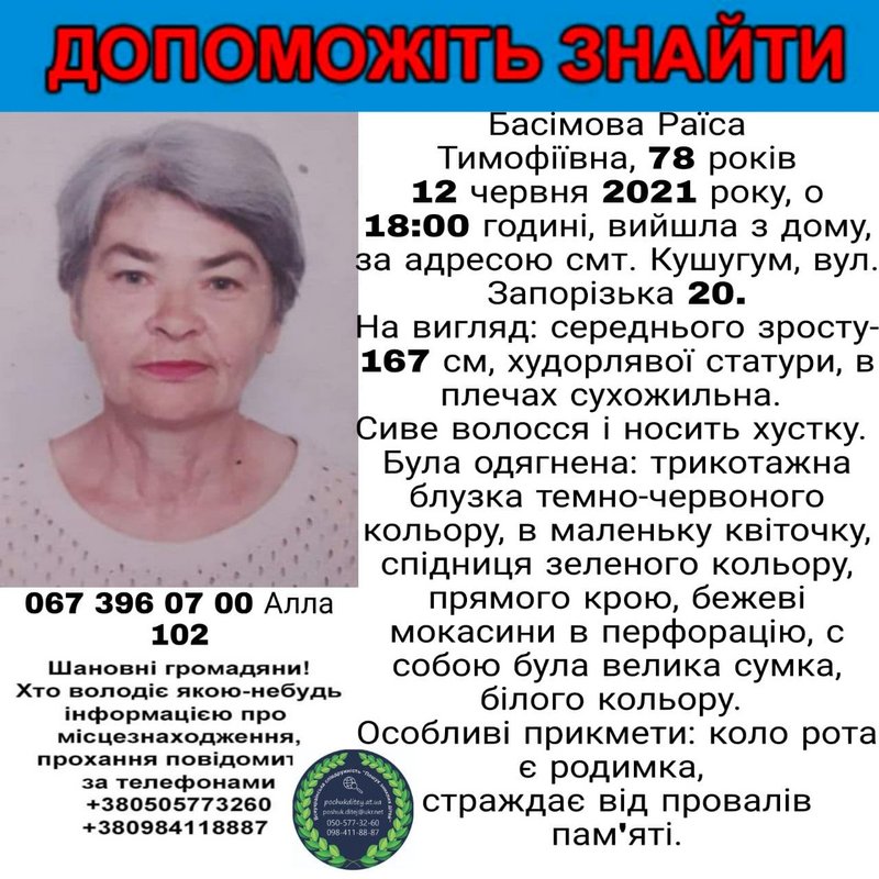 Так, 2 дня назад, 12 июня в 18:00 вышла из дома по улице Запорожская, 20 в пгт Кушугум (недалеко от Запорожья) 78-летняя Басимова Раиса Тимофеева. До настоящего времени женщина не вернулась.