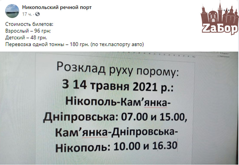Также на странице Никопольского речного порта сообщили, что на пароме также можно будет перевозить автомобили при наличии техпаспорта. Стоимость перевозки одной тонны – 180 гривен.