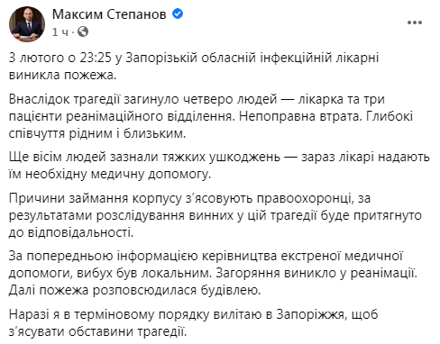 На своей странице Фейсбук Максим Степанов отметил, что "Чотири людини загинули внаслідок пожежі на території обласної інфекційної лікарні в місті Запоріжжя. Ще 12 людей зазнали ушкоджень і сім евакуйовано – поряд із ними рідні та лікарі. Причини займання корпусу з’ясовують правоохоронці, за результатами розслідування винних у цій трагедії буде притягнуто до відповідальності за законом".