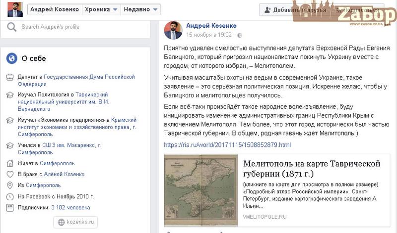 Депутат Государственной Думы РФ Андрей Козенко пообещал депутату ВР от Оппоблока Евгению Балицкому инициировать изменение административных границ Республики Крым, с включением в ее состав Мелитополя, сообщает "ZаБор".