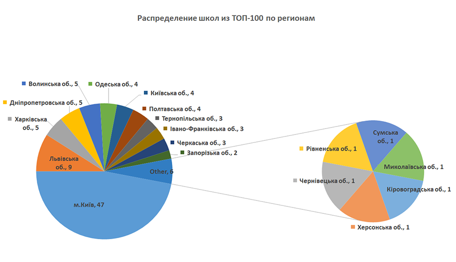 Так, иформационно образовательным ресурсом "Освіта.ua" составлен рейтинг общеобразовательных школ Украины по итогам ВНО 2017 года. Лучшие школы Украины, преимущественно, находятся в Киеве. В тройку лучших также вошли школы Днепропетровска (2 место) и Львова (3 место). Школы Запорожья могут рассчитывать лишь на ТОП-100.