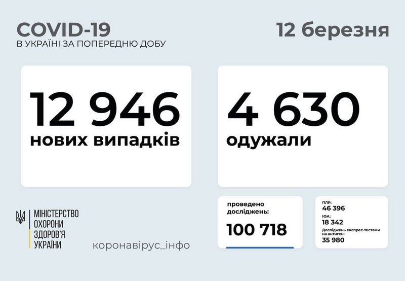 12 946 новых случаев коронавирусной болезни COVID-19 зафиксировано в Украине по состоянию на 12 марта 2021 года. В частности, заболели 649 детей и 450 медработников. В Запорожской области зарегистрировано 272 новых случая на COVID-19. Всего состоянием на 12 марта 2021 зарегистрировано 71 491 лабораторно подтвержденных случаев. В том числе: 3769 – среди детей (7 за сутки) и 4102 среди медработников (10 за сутки). Такие данные передает МОЗ и Запорожский лабораторный центр. Подробнее – "ZаБор".