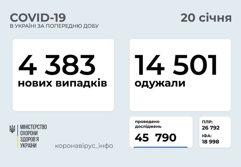4 383 новых случаев коронавирусной болезни COVID-19 зафиксировано в Украине по состоянию на 20 января 2021 года. В частности заболели 161 ребенок и 239 медработников. В Запорожской области зарегистрировано 426 новых случаев на COVID-19. Всего состоянием на 20 января зарегистрировано 62 919 лабораторно подтвержденных случаев. В том числе: 3363 – среди детей (30 за сутки) и 3737 среди медработников (42 за сутки). Такие данные передает МОЗ и Запорожский лабораторный центр. Подробнее – "ZаБор" .