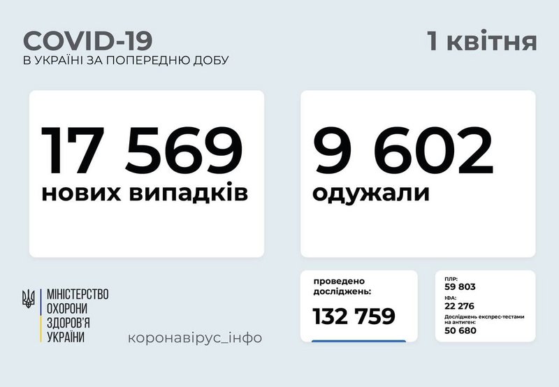 17 569 новых случаев коронавирусной болезни COVID-19 зафиксировано в Украине по состоянию на 01 апреля 2021 года. В частности, заболели 813 детей и 486 медработников. В Запорожской области зарегистрировано 627 новых случая на COVID-19. Всего состоянием на 01 апреля 2021 зарегистрировано 79 013 лабораторно подтвержденных случаев. В том числе: 4198 – среди детей (41 за сутки) и 4366 среди медработников (24 за сутки). Такие данные передает МОЗ и Запорожский лабораторный центр. Подробнее – "ZаБор".