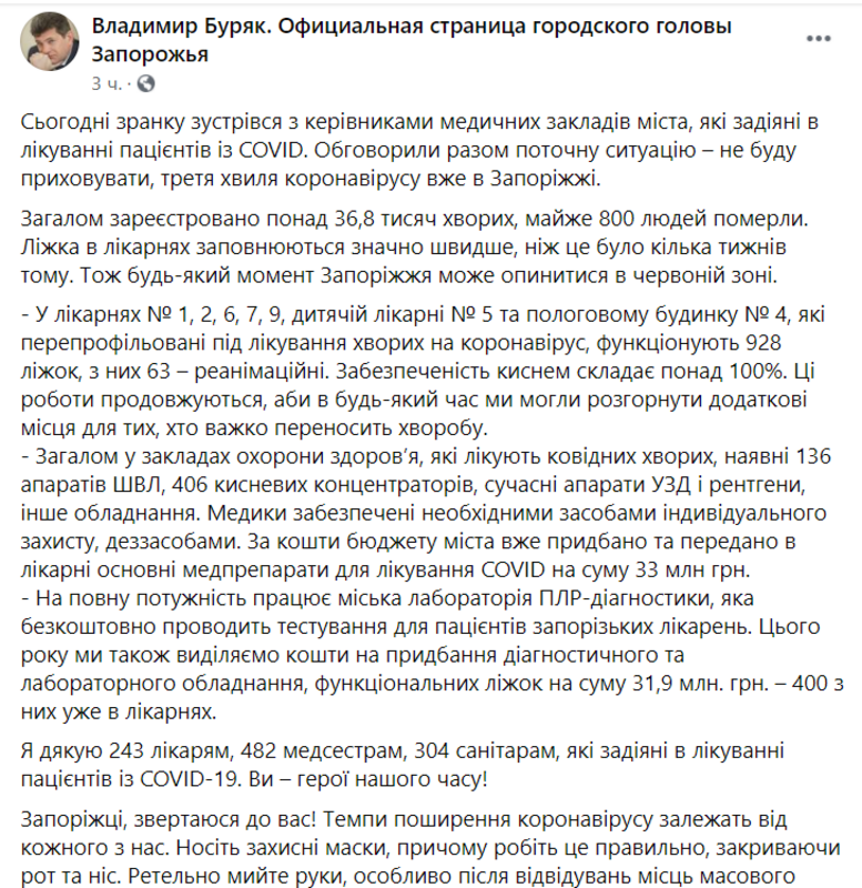 "Сьогодні зранку зустрівся з керівниками медичних закладів міста, які задіяні в лікуванні пацієнтів із COVID. Обговорили разом поточну ситуацію – не буду приховувати, третя хвиля коронавірусу вже в Запоріжжі", - говорит Владимир Буряк.