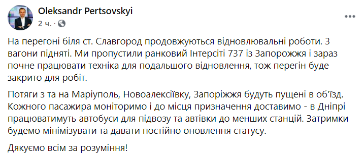Так, на своей странице в соцсети директор филиала "Пассажирская компания" "Укрзализныци" Александр Перцовский сообщил, что работы возле станции Славгород продолжаются, уже поднято 3 вагона. Также директор филиала отмечает, что утренний рейс "Интерсити" №737 из Запорожья – пропустили, и сейчас начнет свою работу техника для дальнейшего восстановления, перегон будет закрыт для работ.