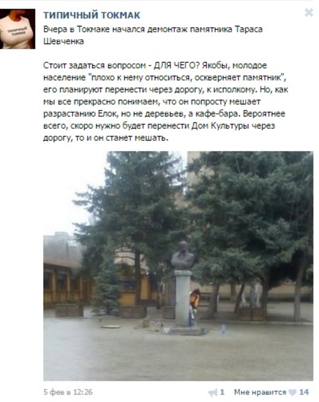В субботу по ряду запорожских СМИ прошла информация о том, что в Токмаке снесли памятник Тарасу Шевченко. Тогда сообщалось, что решения о сносе памятника властями не принималось. Так, по заявлениям депутата Токмакского горсовета Вадима Лукаша, решение о сносе было принято единолично городским головой.