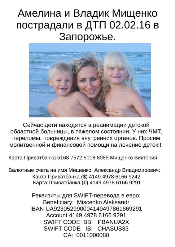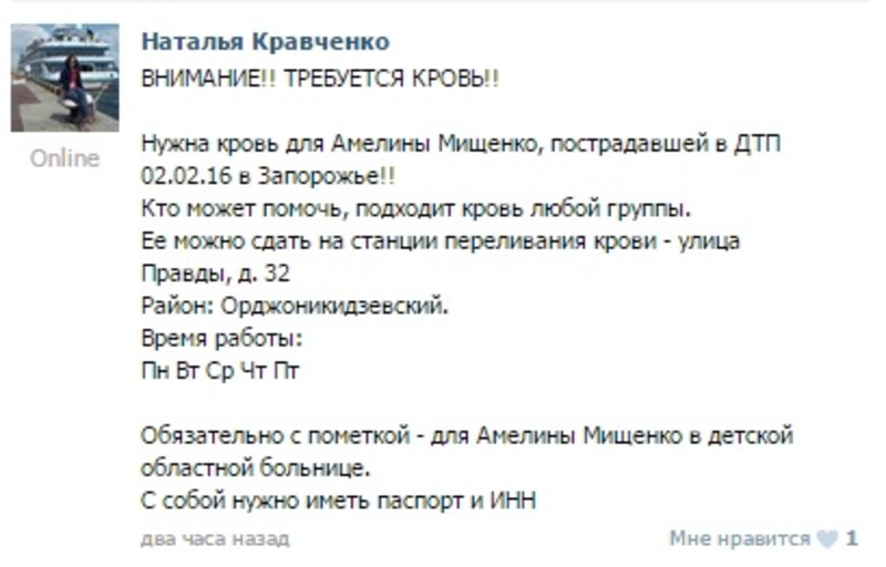 Как сообщает "Первый Запорожский", родственница пострадавшей семьи сообщила о том, что девочка, Амелина, до сих пор не пришла в сознание. По ее словам, врачи утверждают, что девочке необходима донорская кровь. Как уверили запорожские медики, кровь подойдет любой группы.
