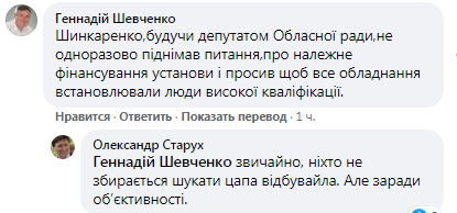При этом в комментариях депутат облсовета от партии "Єдність" Геннадий Шевченко заявляет, что Шинкаренко не раз обращался в облсовет по поводу ненадлежащего финансирования инфекционной больницы. На что Старух пишет следующее: "Звичайно, ніхто не збирається шукати цапа відбувайла. Але заради об’єктивності."