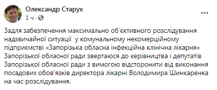 Сегодня, 5 февраля, пост на своей старице Фейсбук разместил глава ОГА Александр Старух. Так, Старух требует на время расследования отстранить от исполнения должностных обязанностей директора Областной инфекционной больницы Владимира Шинкаренко, для обеспечения максимальной объективности.