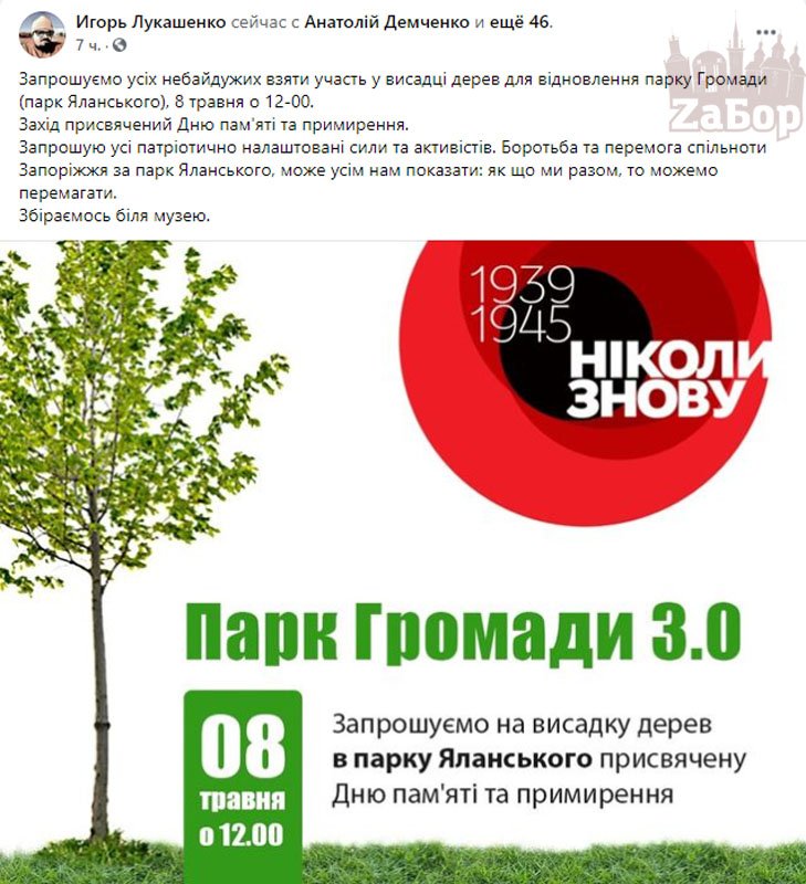 На своей странице в Фейсбук известный общественник, который выступает против застройки сквера Яланского Игорь Лукашенко, призвал запорожцев прийти в сквер Яланского (который активисты упорно называют парком для того), для того чтобы высаживать деревья для обновления уничтоженного парка.