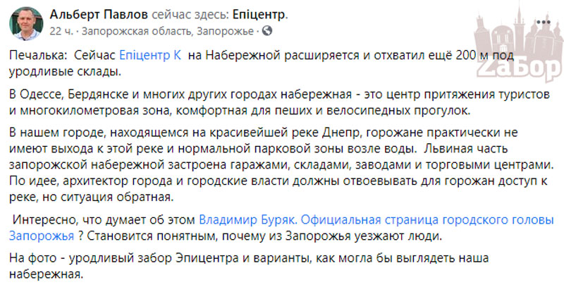 Так, на своей странице в Фейсбук президент фонда "Счастливый ребенок" Альберт Павлов высказал свое недовольство тем, что на Набережной расширяют гипермаркет "Эпицентр". Он еще "отхватил" 200 метров под склады, рассказывает Альберт Павлов.
