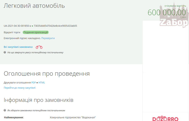 Запорожское коммунальное предприятие "Водоканал" объявило тендер на приобретение легкового автомобиля за 600 тысяч гривен, передает "ZаБор".
