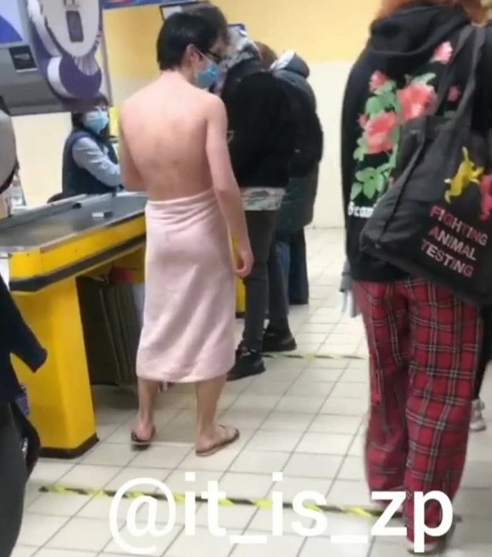 26 марта в магазине АТБ на Лермонтова Вознесеновского района города, юноша рассчитывался на кассе в одном полотенце, но при этом он был в маске и очах. А после магазина, молодой человек эффектно прошелся по улице.