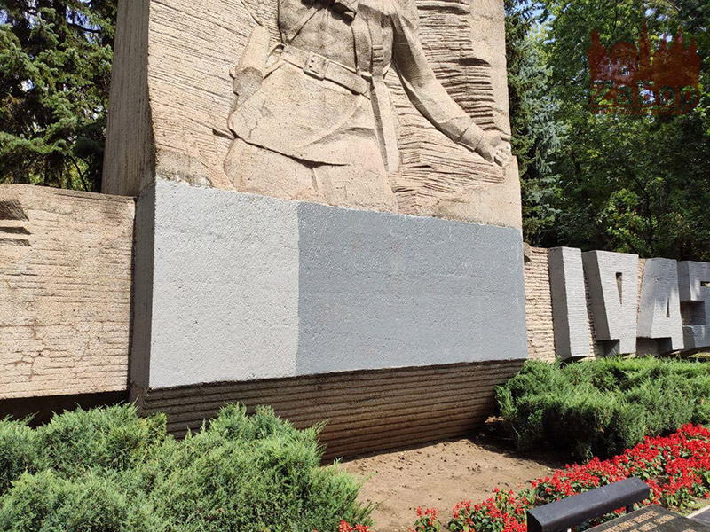 В то время как запорожцы поддерживают белорусов, разрисовывая памятники флагами и лозунгами, местные коммунальщики поддерживают Запорожье, закрашивая эти лозунги серой краской, передает "ZаБор".