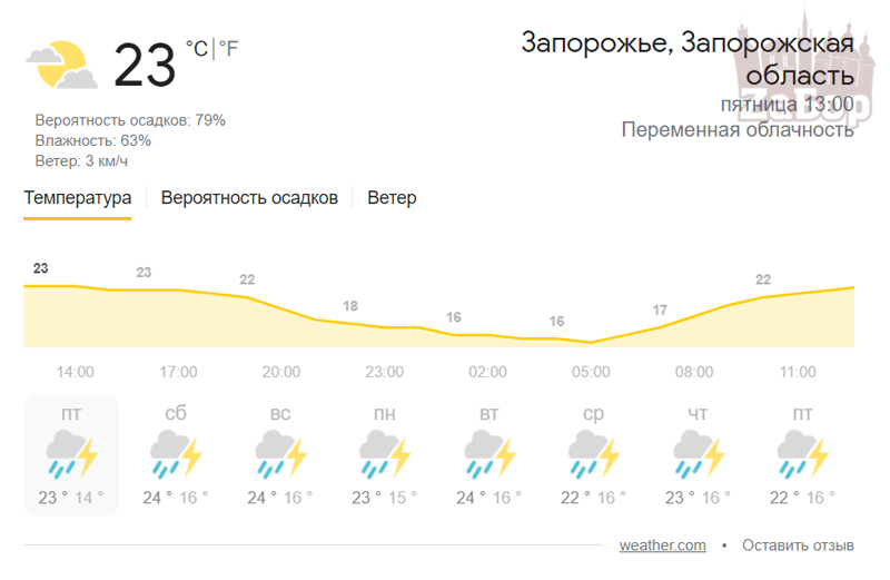 Так, согласно данным Запорожского областного центра гидрометеорологии на выходных 12 и 13 июня будут грозы, температура воздуха при этом достигнет до +27 градусов. Сохранится такая погода до 16 июня, правда температура снизится на 2 градуса, будет +25.