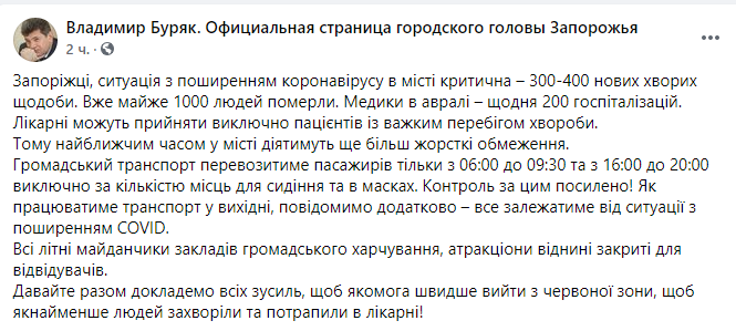 12 апреля мэр города Владимир Буряк сообщил о том, что в ближайшее время в Запорожье будут действовать еще более жесткие ограничения. Связанно это с ростом заболеваемости COVID-19. Как говорит мэр, ситуация в городе критическая, каждые сутки по 300-400 новых случаев заболевания.