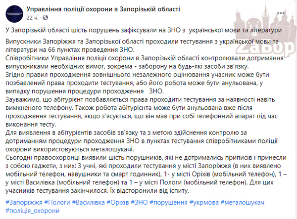 Вчера в Запорожской области состоялось ВНО по украинскому языку и литературе. Сотрудники полиции охраны снова зафиксировали нарушения при сдаче экзаменов. Так, 3 было зафиксировано в Запорожье и 3 по области. Об этом сообщают на странице Управления полиции охраны в Запорожской области, передает "ZаБор".