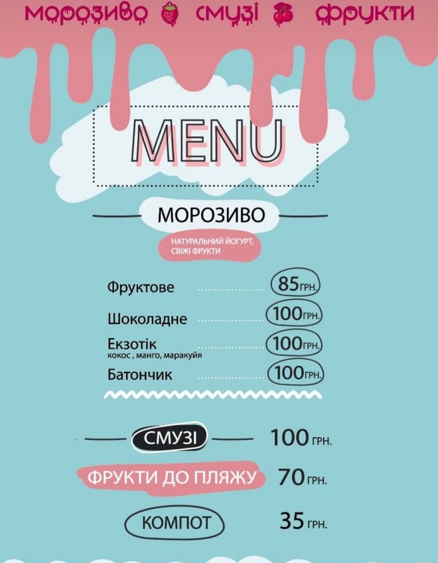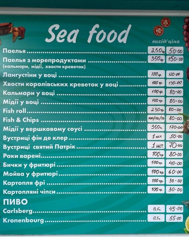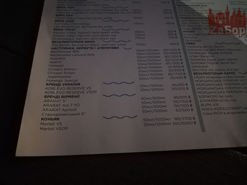 Что касается цен, то в меню Pool&beach к примеру, пиццу можно было заказать от 120 до 200 гривен. Также был небольшой выбор салатов и мясных блюд. Однако, стоит отметить, что в меню Pool&beach большая алкогольная карта. Так, самым дорогим спиртным напитком был коньяк Martell VSOP за 6000 гривен за литр (300 грн/50 мл), а еще тут было безалкогольное вино за 400 грн/бутылка. Коктейли от 75 грн.