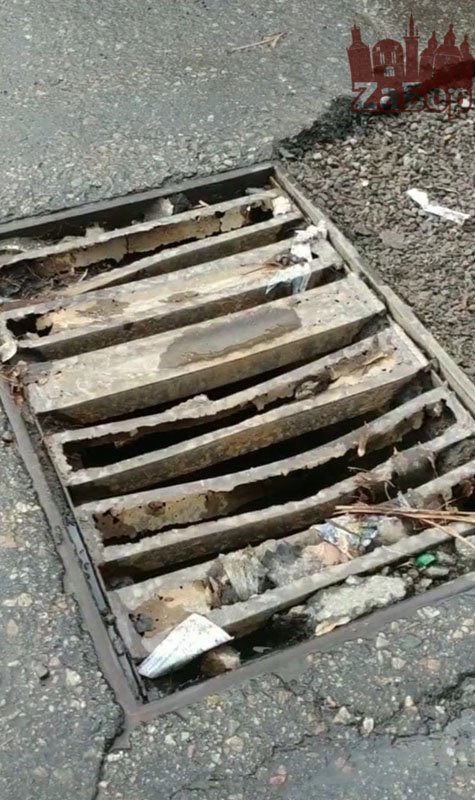 Не в лучшем состоянии и решетка, которая накрывает водосток. Так, она просто прогнила, а сама вода никуда не уходит. Автор видео отмечает, что если по ней еще раз пройдет машина, она просто провалится.