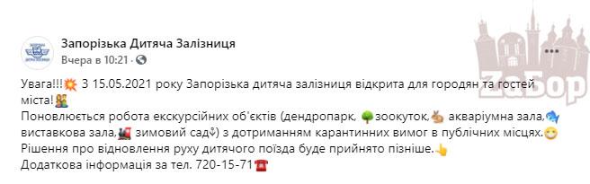 На официальной странице в Фейсбук сообщили о том, что завтра, 15 мая, Детская железная дорога возобновляет свою работу после карантина. Так, начнут работать экскурсионные объекты: дендропарк, зооуголок, аквариумный и выставочный залы, зимний сад.