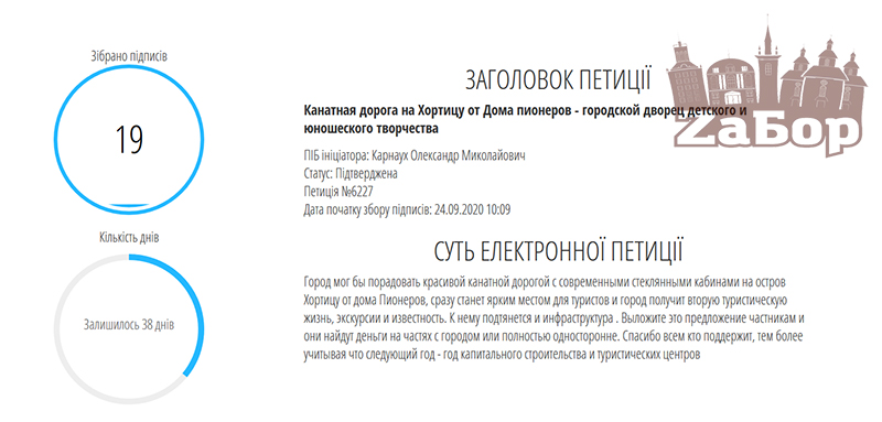 Автор петиции Карнаух Александр предлагает соединить два берега Днепра канатной дорогой с современными стеклянными кабинками, что могло бы привлечь и инвесторов, и туристов в Запорожье.