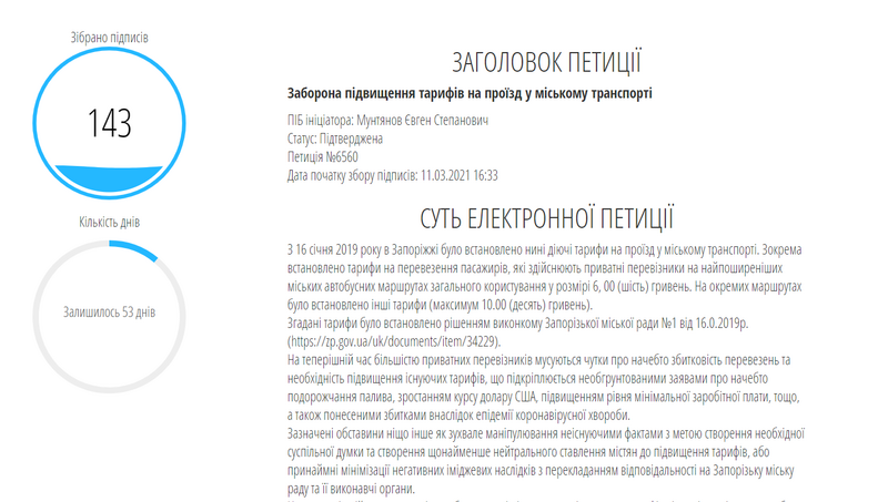 11 марта на сайте электронных петиций Запорожья появилась петиция о том, чтобы запретить повышать цены на проезд в общественном транспорте на время COVID-19. Автором петиции выступил Евгений Мунтянов.